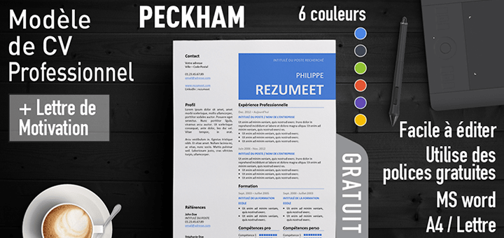 Peckham est un modèle de CV gratuit et professionnel. Design simple pour un CV fonctionnel. Ce modèle de CV utilise un design avec structure à 2 colonnes. Bandeau vertical partiel de couleur à droite. Inclut les modèles de lettre de motivation.